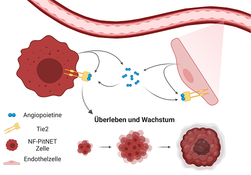 Vielversprechender Therapieansatz bei Hypophysentumoren21. März 2022 Expression von Tie2 und Markern von Hypophysenzellen in primären PitNETs der Ratte. (Quelle. Natalia S. Pellegata9 Hypophysentumoren sind die dritthäufigste Hirntumorart. Insbesondere Tumoren vom nichthormonproduzierenden Typ werden meist so spät entdeckt, dass sie zum Diagnosezeitpunkt schon nicht mehr vollständig reseziert werden können. Gefördert von der Wilhelm Sander-Stiftung haben Forschende bei Helmholtz Munich einen neuen Signalweg entdeckt, der in diesen Tumoren aktiviert wird und ein vielversprechendes Ziel für die Therapie darstellt. Neuroendokrine Hypophysentumoren (engl. „Pituitary Neuroendocrine Tumors“, kurz PitNETs) sind raumfordernde Neubildungen in der Hirnanhangsdrüse und treten bei bis zu einem Prozent der Bevölkerung auf. Damit sind Hypophysentumoren die dritthäufigste Hirntumorart. Zudem unterscheidet man zwischen endokrin aktiven, d. h. „funktionierenden Tumoren“ (engl. Functioning Pituitary Neuroendocrine Tumors, kurz F-PitNETs), die sich aus den Drüsenzellen der Hypophyse entwickeln und bestimmte Hormone produzieren, und hormoninaktiven, d. h. „nicht funktionierenden Tumoren“ (engl. Non Functioning Pituitary Neuroendocrine Tumors, kurz NF-PitNETs), die keine Hormone freisetzen. Allerdings sind die meisten dieser Tumoren gutartig und brauchen zunächst keine Behandlung. Daher werden sie auch häufig als Hypophysenadenome bezeichnet. Wenn neuroendokrine Hypophysentumoren jedoch größer werden oder zu viel Hormone produzieren, treten Symptome wie zum Beispiel Kopfschmerzen oder Sehstörungen auf, die therapiert werden müssen. Insbesondere nicht funktionsfähige Hypophysentumoren (NF-PitNETs) werden oft erst in späten Stadien der Tumorentwicklung diagnostiziert, da sie keine Hormone freisetzen, durch die sie schneller entdeckt werden könnten. Zum Diagnosezeitpunkt in diesem späten Stadium sind 50 Prozent der Tumoren bereits in umliegende Bereiche eingedrungen, sehr aggressiv und können durch eine Operation nicht mehr vollständig entfernt werden. Daher kehren sie oft zurück und verursachen schwere gesundheitliche Folgen für die Patienten. Zu den üblichen Behandlungsmethoden für Hypophysentumoren gehören neben der chirurgischen Entfernung die medikamentöse Therapie mit Dopaminaktivatoren, synthetischem Somatostatin oder Temozolomid sowie die Strahlentherapie. Allerdings sprechen Tumoren vom nichthormonproduzierenden Typ auf die genannten Medikamente nicht an, und die Strahlentherapie verursacht schwere Nebenwirkungen. Da dieser Tumortyp mit den vorhandenen Behandlungsmöglichkeiten nicht zu heilen ist, ist die Entwicklung neuer Therapieansätze für NF-PitNETs von großer Dringlichkeit. Das Hauptziel der von der Wilhelm Sander-Stiftung geförderten Studie des Teams um Forschungsgruppenleiterin Prof. Natalia S. Pellegata vom Institut für Diabetes und Krebs bei Helmholtz Munich bestand nun darin, neue Angriffspunkte für Medikamente gegen hormoninaktive Hypophysentumoren zu finden, um die klinische Behandlung der Patienten zu verbessern. Die Angiogenese als kritischer Prozess Die Krebsentwicklung ist ein dynamischer Prozess, der durch die Interaktion verschiedener Zellen und Moleküle bestimmt wird, die die Mikroumgebung des Tumors ausmachen. Zu den Zellen in der Mikroumgebung des Tumors gehören Endothelzellen, die an der Angiogenese beteiligt sind. Zu den Molekülen, die die Angiogenese regulieren, gehören die Angiopoietine (Angpt), Signalmoleküle, die an den Rezeptor Tie2 auf der Zellmembran der Endothelzellen binden. Die zwei bekanntesten Moleküle sind Angpt1 und Angpt2: Angpt1 aktiviert den Tie2-Rezeptor und fördert die Gefäßstabilität, während Angpt2 den Rezeptor nur dann aktiviert, wenn es in hoher Konzentration vorhanden ist. In Tumoren schütten die Endothelzellen hohe Mengen an Angpt2 aus. Zudem ist bereits bekannt, dass auch Tumorzellen selbst Angpt2 bilden und absondern können. So wurden insbesondere im Blut von Tumorpatienten in einem fortgeschrittenen Krankheitsstadium erhöhte Angpt2-Konzentrationen festgestellt, was ebenfalls mit schlechteren Aussichten auf Heilung korrelierte. Tumor- und Endothelzellen stehen in der Mikroumgebung des Hypophysentumors in Wechselwirkung. (Abb.: Natalia S. Pellegata) Ausgangspunkt des aktuellen Forschungsvorhabens von Natalia S. Pelegata und ihrem Team war die Beobachtung, dass NF-PitNET-Patienten ebenfalls einen erhöhten Angpt2-Spiegel im Blut aufweisen, der mit der Aggressivität des Tumors korreliert. Dieser Befund veranlasste die Wissenschaftler, die Werte und die Rolle von Angpt2 bei NF-PitNETs genauer zu untersuchen. Anhand von Zellkulturen konnte die Forschungsgruppe in ihrer Studie zeigen, dass auch NF-PitNETs hohe Werte von Angpt2 aufweisen und dieses ausschütten, was zum Wachstum von Tumorzellen führt. Auch bei den im Rahmen der Forschungsarbeiten untersuchten Fischembryonen führte die Ausschüttung von Angpt2 zur Angiogenese. Interessanterweise verfügen NF-PitNETs ebenfalls über den Tie2-Rezeptor, der sich auf der Zelloberfläche befindet und durch Angpt2 aktiviert werden kann. Ähnlich wie bei Endothelzellen stimuliert Tie2 die Zellteilung in Tumorzellen. Die Wissenschaftler konnten so beweisen, dass Angpt2 und Tie2 auch das Überleben und Wachstum von PitNE-Tumorzellen aufrechterhalten. Gelänge es, den Rezeptor Tie2 in PitNET-Zellen auszuschalten, könnte ihr Wachstum jedoch gezielt unterdrückt werden. Neues Konzept für die Krebsbekämpfung Um zu belegen, dass der Angpt2/Tie2-Signalweg ein mögliches Ziel für eine Behandlung darstellt, wurden im nächsten Schritt Medikamente, die diesen Signalweg blockieren, in experimentellen Modellen von NF-PitNETs getestet. So gelang es der Forschungsgruppe um Pellegata nachzuweisen, dass die Blockierung des Angpt2/Tie2-Signalwegs das Wachstum der Tumorzellen in Zellkulturen und in Tiermodellen tatsächlich reduziert. „Der Angpt2/Tie2-Signalweg erwe