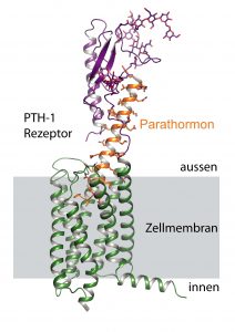 Vom Rezeptoraufbau zu neuen Osteoporose-Medikamenten21. November 2018 Foto: © crevis – Fotolia.com Forschende der Universität Zürich haben die dreidimensionale Struktur eines Rezeptors aufgeklärt, der die Freisetzung von Kalzium aus den Knochen kontrolliert. Der Rezeptor ist damit eines der wichtigsten Ziele für neue Medikamente gegen Osteoporose, eventuell könnte sogar der Wiederaufbau des Knochens gelingen. Der Knochenabbau bei Osteoporose geschieht langsam und schleichend über viele Jahre ohne merkliche Symptome. Kalzium wird vom Körper langsam aus den Knochen herausgelöst, die dann spröde werden und schliesslich brechen. Der Körper kontrolliert diesen Prozess durch ein Hormon, das Parathormon (PTH), und ein nahe verwandtes Peptid – ein Proteinfragment. Diese binden an den PTH-1-Rezeptor, der dem Körper mitteilt, entweder Kalzium aus dem Knochen herauszulösen oder neuen Knochen aufzubauen. Enorm schwierig zu untersuchender Rezeptor Andreas Plückthun, Professor am Biochemischen Institut der Universität Zürich (UZH), und seinem Team ist es gelungen, die dreidimensionale Struktur des PTH-1-Rezeptors bestimmen. Die im atomaren Detail aufgeklärte Struktur dient nun als Bauplan, um neue Medikamente zu entwickeln. Solche rezeptorbindenden Substanzen könnten die Osteoporose verlangsamen und vielleicht teilweise sogar wieder rückgängig machen. Die Strukturbestimmung war enorm schwierig, da die Zellen nur sehr geringe Mengen des Rezeptors herstellen, der zudem sehr instabil ist. «Die Methoden der gerichteten Evolution und des Protein Engineering, die wir über die letzten Jahre entwickelt haben, waren absolut entscheidend dafür», erklärt Plückthun. Nachteile der aktuellen Osteoporose-Behandlung Substanzen, die wie das natürliche Hormon und das verwandte Peptid aussehen, zählen zu den wirksamsten verfügbaren Behandlungsmethoden der schweren Osteoporose. «Doch diese sind extrem teuer, und müssen täglich in den Oberschenkel oder Bauch gespritzt werden. Zudem hat die Therapie grosse Nebenwirkungen», sagt Christoph Klenk, Mitautor der Studie. Die Wissenschaftler sind überzeugt, dass mit den neu gewonnenen Erkenntnissen über den Mechanismus dieses Rezeptors nun Medikamente entwickelt werden können ohne diese Nachteile. Der Rezeptor sei wie ein Schloss, und die Peptide seien die Schlüssel, die es drehen, beschreibt Plückthun. «Mit dem atomaren dreidimensionalen Bauplan, dargestellt auf dem Computer-Bildschirm, haben wir jetzt einen beispiellosen Einblick, wie das Schloss eigentlich funktioniert.» Relevant für eine ganze Klasse von Rezeptoren Der PTH-1-Rezeptor besteht aus einem extrazellulären Teil (violett) und einem Teil, der in der Zellmembran sitzt (grün). Das Parathormon (orange) aktiviert den Rezeptor. (Bild: Universität Zürich) Der PTH-1-Rezeptor gehört zur Familie der G-Protein-gekoppelten Rezeptoren. Dazu gehören insbesondere Rezeptoren, die andere Hormone binden – wie etwa jene, die Diabetes kontrollieren. Die Arbeiten der UZH-Forschenden bringen auch Licht in die Funktionsweise der ganzen Rezeptorfamilie. Denn so detailliert wie der PTH-1-Rezeptor wurde noch keiner dieser Rezeptoren entschlüsselt. Dadurch konnten die Wissenschaftler sowohl Ähnlichkeiten wie auch Besonderheiten im Vergleich zu den anderen Klasse B-Rezeptoren beschreiben. «Mit dem Bauplan des Schlosses haben wir zwar noch keinen Schlüssel in der Hand. Aber nun ist es möglich, einen solchen zu bauen», sagt Andreas Plückthun. Die Arbeiten von Andreas Plückthun am Biochemischen Institut der Universität Zürich wurden finanziert vom Schweizerischen Nationalfonds, und Christoph Klenk wurde unterstützt von Stipendien der Deutschen Akademie der Wissenschaft (Leopoldina) und der Europäischen Union. An der Studie waren auch Forscher der britischen Firma Heptares und Heptares Therapeutics Zurich beteiligt, die aus einer von Plückthun mitgegründeten Spin-off-Firma der UZH entstanden ist. Originalpublikation: Ehrenmann J et al. High-resolution crystal structure of parathyroid hormone 1 receptor in complex with a peptide agonist. Nature Structural and Molecular Biology, November 19, 2018.
