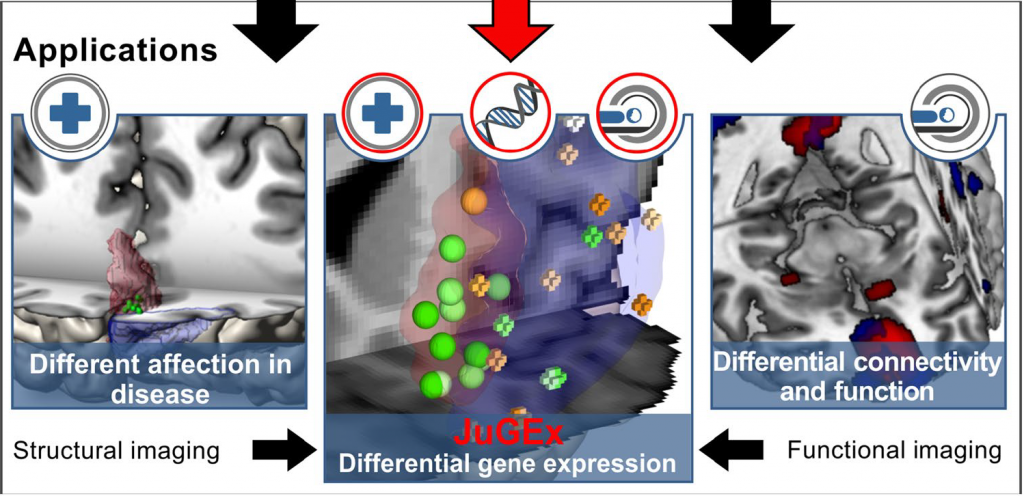 Von der Genexpression zur Mikrostruktur des Gehirns27. April 2018 Der dreidimensionale zelluläre JuBrain-Atlas basiert auf mikrostrukturellen Kartierungen von zehn post mortem-Gehirnen und zeigt die interindividuelle Variabilität der anatomischen Areale. (Copyright: Forschungszentrum Jülich/HBP) Ein neues Werkzeug des Human Brain Project hilft dabei, die Rolle von Genen in krankheitsrelevanten Hirnregionen zu untersuchen. Wie beeinflussen Gene die Funktionsweise des Gehirns? Mit einem neuen digitalen Werkzeug, das Forscher des Forschungszentrums Jülich im europäischen Human Brain Project (HBP) entwickelt haben, lässt sich dieser Zusammenhang jetzt besser verstehen. Das JuBrain Gene Expression Tool, kurz JuGEx, verbindet die Vorzüge eines genetischen und eines anatomischen Atlasses. Wissenschaftler können damit nun erforschen, wie bestimmte Gene, die in anatomisch definierten Hirnbereichen aktiv sind, zur Funktion und Fehlfunktion des Gehirns beitragen. In einer ersten Analyse konnten sie so bereits zwei Gene bestimmen, die in einem Teil des Gehirns besonders aktiv sind, der bei Patienten mit Depression erkennbare Veränderungen aufweist. Verschiedene Atlanten des Gehirns zusammenführen Um die Komplexität des menschlichen Gehirns zu beschreiben, sind weltweit groß angelegte Kartierungsprojekte gestartet worden, die sich auf unterschiedliche Aspekte der Hirnorganisation konzentrieren. Dies hat zur Folge, dass es heute eine Reihe verschiedener Atlanten des Gehirns gibt, deren Fokus jeweils auf unterschiedlichen Aspekten liegt. So ist etwa der amerikanische Allen Brain Atlas daraufhin angelegt, die Expression von Genen zu studieren. Der am Forschungszentrum Jülich entwickelte JuBrain Atlas dagegen liefert Karten auf Basis von Zellarchitekturen, mit denen sich verschiedene Hirnbereiche und ihre unterschiedliche Ausprägung in einzelnen Gehirnen bestimmen lassen. „Die Verbindung von Daten aus beiden Atlanten ist ein wichtiger Schritt zur Überbrückung der verschiedenen Ebenen der Hirnorganisation. Wir müssen Möglichkeiten finden nachzuvollziehen, wie sich beispielsweise die Genexpression auf die Ebene der Mikrostruktur auswirkt“, sagte Prof. Katrin Amunts vom Forschungszentrum Jülich. Die Neurowissenschaftlerin ist wissenschaftliche Direktorin des HBP und leitet die Entwicklung des HBP-Atlasses, eines digitalen 3D-Modells, das viele verschiedene Skalen und Modalitäten integriert. Ihr Team hat dafür nun JuGEx entwickelt. Das frei verfügbare Tool ermöglicht es, genetische Daten aus dem Allen Brain Atlas mit den mikrostrukturellen Karten von JuBrain zu verknüpfen. „Unser Ansatz macht es sehr einfach, zu testen, welche Gene in frei wählbaren Hirnregionen unterschiedlich stark exprimiert sind“, erkärte Thomas Mühleisen, Genetiker am Forschungszentrum Jülich. Zusammen mit dem Neuroanatom Sebastian Bludau leitete er die Entwicklung von JuGEx. „Wenn man sich für Merkmale des Gehirns interessiert, die zum Beispiel durch strukturelle Magnetresonanztomografie identifiziert wurden, können wir die Genexpression, sprich die Aktivität von Genen, in dieser Region jetzt mit hoher räumlicher Genauigkeit untersuchen“, erklärte Mühleisen. Bereits zwei Treffer gelandet Um den Nutzen von JuGEx zu testen, untersuchte das Team damit einen Aspekt von Depression, eine psychische Erkrankung mit starker Erblichkeit. „In einer unserer vorangegangenen Bildgebungsstudien mit JuBrain-Karten hatten wir festgestellt, dass das Volumen an grauer Hirnsubstanz im medialen Frontalpol bei Patienten mit dieser Pathologie im Vergleich zu gesunden Kontrollpatienten signifikant reduziert ist“, erklärte Bludau. „Dieses Areal ist anhand seiner Mikrostruktur abgrenzbar und spielt in der Regulierung von Emotionen eine Rolle.“ Der mediale Frontalpol (rot) ist bei Depression betroffen. JuGEx ermöglicht die Lokalisierung von Genexpressionsdaten aus Gewebeproben (farbige Kugeln). (Copyright: Forschungszentrum Jülich/HBP) Das Team verwendete dann JuGEx zum Abgleich einer Reihe von Kandidatengenen für Depression in diesem Areal und landete zwei Treffer: eine signifikante Hochregulierung der Gene MAOA und TAC1. MAOA kodiert ein Enzym, das beim Abbau von Neurotransmittern wie Serotonin wichtig ist, während TAC1 Hormone produziert, die bei Neuronen-Anregungen und Verhaltensreaktionen eine Rolle spielen. „Wie die anderen Tools des HBP-Atlas wird auch JuGEx kontinuierlich weiterentwickelt und mit weiteren Funktionalitäten ausgestattet. Wir hoffen, dass es von einer breiteren, interdisziplinären Forschungsgemeinschaft als nützlich erachtet wird“, fasste Amunts zusammen.