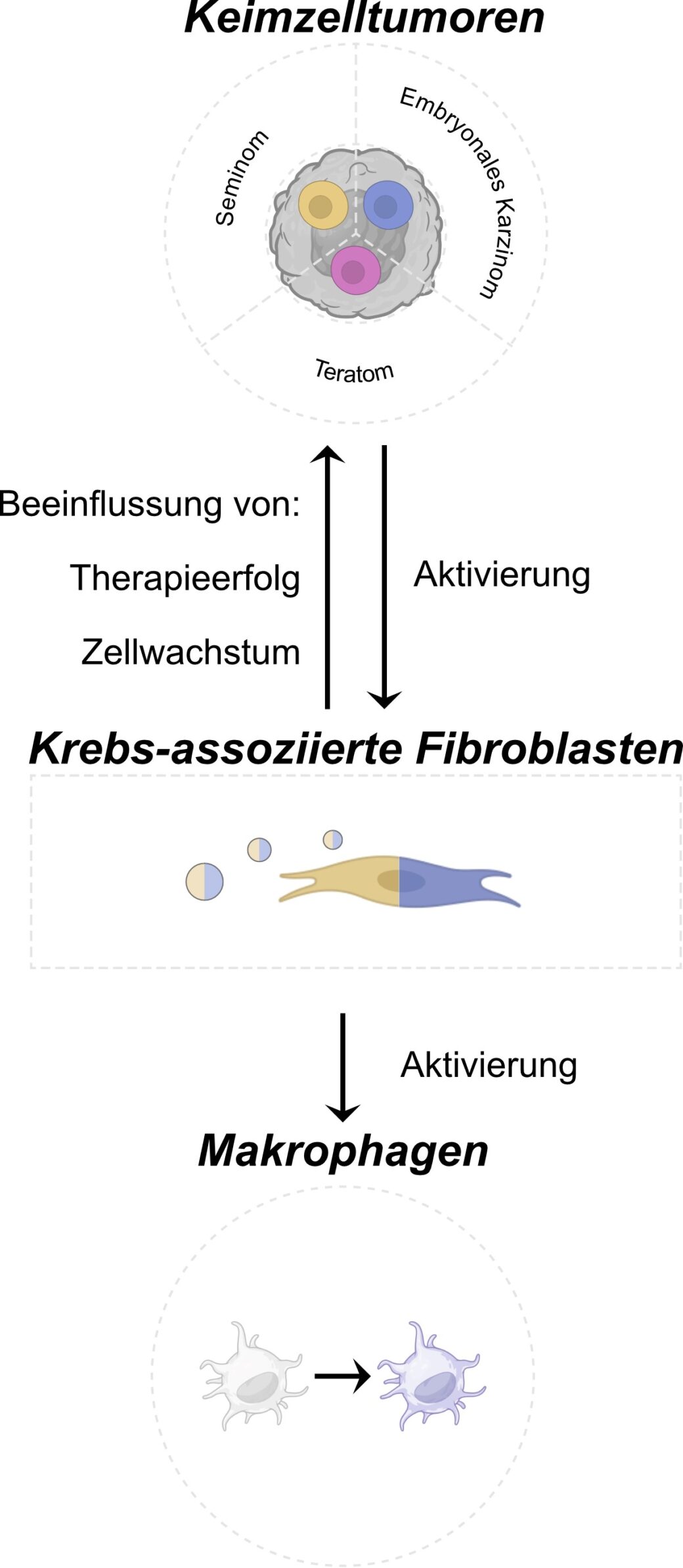 Wechselwirkungen zwischen Hodentumorzellen, Immunzellen und Fibroblasten18. Juli 2024 Fibroblasten (Symbolbild). Grafik, KI-generiert: jovannig – stock.adobe.com Forschende um Prof. Daniel Nettersheim vom Universitätsklinikum Düsseldorf haben die molekularen und epigenetischen Eigenschaften von Hodentumor-assoziierten Fibroblasten entschlüsselt. Ihre Studie zeigte, dass verschiedene Subtypen von Hodentumoren die Fibroblasten unterschiedlich stark aktivieren. Das Team identifizierte neue Botenstoffe, die von krebsassoziierten Fibroblasten freigesetzt werden. Diese könnten Immunzellen beeinflussen und an der Entstehung von Therapieresistenz bei Hodentumoren beteiligt sein. Die Studie wurde von der Wilhelm Sander-Stiftung mit 160.000 Euro gefördert und in „Matrix Biology“ veröffentlicht. Testikuläre Keimzelltumoren, auch Hodentumoren genannt, betreffen vor allem junge Männer im Alter von 15 bis 44 Jahren. Obwohl Hodenkrebs eine gut behandelbare Krebsart ist, steigt die Zahl der Neuerkrankungen in den letzten Jahren kontinuierlich an. Als Ursache wird unter anderem der westliche Lebensstil diskutiert, der mit einer hohen Belastung durch Chemikalien, wie Weichmachern oder hormonähnlich wirkenden Substanzen einhergeht. Ebenso können die meist jungen Patienten eine Therapieresistenz entwickeln, die trotz multimodaler Therapie tödlich enden kann. Das Forschungsteam um Nettersheim hat bereits in früheren Studien die Bedeutung der Interaktion zwischen Keimzelltumorzellen und dem umgebenden Mikromilieu aufgezeigt. Im Mittelpunkt der aktuellen Studie standen die Fibroblasten, die normalerweise für den Erhalt der Gewebsfestigkeit mitverantwortlich sind. Nach einer Interaktion mit Tumorzellen werden diese Zellen zu krebsassoziierten Fibroblasten aktiviert und können dann die Tumorprogression und das Therapieergebnis beeinflussen. Daher ist es wichtig, diese Interaktion von Tumorzellen mit Fibroblasten besser zu verstehen, um neue Therapiekonzepte zu entwickeln und Therapieresistenzen zu umgehen. Charakterisierung der molekularen und epigenetischen Eigenschaften Die Forschenden führten eine detaillierte Charakterisierung der molekularen und epigenetischen Eigenschaften von Hodenkrebs-assoziierten Fibroblasten durch. Dabei wurden Veränderungen im Erbgut (DNA-Methylierung), bestimmte RNA-Moleküle (Transkriptom) und die von den krebsassoziierten Fibroblasten abgesonderten Proteine (Proteom und Sekretom) gemessen. Es konnte gezeigt werden, dass verschiedene Hodenkrebs-Subtypen die Fibroblasten unterschiedlich stark aktivieren (Abb. 1). Ebenso konnten die Forschenden Botenstoffe identifizieren, die von den krebsassoziierten Fibroblasten ausgeschüttet werden und in Hodentumorzellen die Produktion bestimmter Moleküle erhöhen, die mit Therapieresistenz in Verbindung gebracht werden sowie Immunzellen (Makrophagen) aktivieren. Zusammengenommen kann dies den Therapieerfolg beeinflussen. „Die Ergebnisse dieser Studie verdeutlichen die Beteiligung der krebsassoziierten Fibroblasten an der Entstehung von Keimzelltumoren und einer möglichen Therapieresistenz, aber auch deren Einfluss auf die Aktivierung anderer Zelltypen, wie z.B. Immunzellen“, fasst Prof. Dr. Nettersheim die Studienergebnisse zusammen. „Forschungsstudien wie diese können nicht ohne interne und externe Kooperationen durchgeführt werden und die Universitätsmedizin Düsseldorf bietet hierfür hervorragende Voraussetzungen“, ergänzt Frau Stephan, die Erstautorin der Studie. Denn an diesem Forschungsprojekt waren auch die Core Facilities, Molecular Proteomics Laboratory und Genomics & Transcriptomics des Biologisch-Medizinischen Forschungszentrums (BMFZ) der Heinrich-Heine-Universität Düsseldorf sowie Kooperationspartner des Universitätsklinikums Hamburg-Eppendorf beteiligt. Diese Studie bildet nach Überzeugung der Forscher die Grundlage für weiterführende Analysen der identifizierten Botenstoffe, deren Vorkommen im Tumorgewebe auch als potenzielle Biomarker zur Vorhersage des Krankheitsverlaufs und für neue Therapieansätze dienen können. (Wilhelm Sander-Stiftung / ms) Grafische Zusammenfassung der Studienergebnisse. Fibroblasten können durch Hodenkrebszellen zu krebsassoziierten Fibroblasten aktiviert werden, die ihrerseits Botenstoffe absondern, die das Zellwachstum und den Therapieerfolg der Krebszellen beeinflussen und Immunzellen (Makrophagen) aktivieren können.Bildquelle: © Daniel Nettersheim, Alexa Stephan, HHU