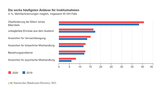 Weniger Inobhutnahmen im Jahr 202029. Juni 2021 Vernachlässigung gehörte im Jahr 2020 zu den häufigsten Gründen für Inobhutnahmen. (Foto: ©vejaa – stock.adobe.com) Die Jugendämter in Deutschland haben im Jahr 2020 rund 45.400 Kinder und Jugendliche zu ihrem Schutz vorübergehend in Obhut genommen. Im Vergleich zum Vorjahr waren dies rund 4100 Fälle weniger, wie aus Daten des Statistischen Bundesamtes (Destatis) hervorgeht. Zwei Drittel (67 %) dieser Inobhutnahmen erfolgten den Daten zufolge wegen einer dringenden Kindeswohlgefährdung, 17 Prozent aufgrund einer unbegleiteten Einreise aus dem Ausland und weitere 17 Prozent auf Bitte der betroffenen Minderjährigen. Ein Drittel (33 %) aller 2020 in Obhut genommenen Jungen und Mädchen war jünger als zwölf Jahre, jedes zehnte Kind (11 %) sogar jünger als 3 Jahre. Im Vergleich zu 2019 sind die Inobhutnahmen um acht Prozent oder rund 4100 Fälle zurückgegangen. Anders als in den beiden Vorjahren war dafür im Corona-Jahr 2020 jedoch nicht allein die sinkende Zahl der Inobhutnahmen nach unbegleiteter Einreise verantwortlich (‑1100 Fälle). Noch deutlicher war der Rückgang in Fällen von dringender Kindeswohlgefährdung (-2100 Fälle). Auch die Zahl der Selbstmeldungen von Jungen und Mädchen hat 2020 – im Unterschied zu den beiden Jahren zuvor – abgenommen (-800 Fälle). Inwieweit diese Entwicklungen in Zusammenhang mit den Lockdowns und den Kontaktbeschränkungen infolge der Corona-Pandemie stehen, lässt sich dem Statistischen Bundesamtes zufolge anhand der vorliegenden Ergebnisse nicht beantworten. Fachleute und Studien wiesen jedoch darauf hin, dass ein Teil der Kinderschutzfälle Corona-bedingt unentdeckt geblieben und das Dunkelfeld somit gewachsen sein könnte. In die offizielle Statistik fließen nur solche Fälle ein, die den Jugendämtern bekannt gemacht wurden und daher dem sogenannten Hellfeld zuzurechnen sind, erklärte das Statistische Bundesamt. Bedeutung von Überforderung und Vernachlässigung wächst Am häufigsten wurden Kinder und Jugendliche 2020 wegen der Überforderung eines oder beider Elternteile in Obhut genommen (41 %). Mit Abstand folgte an zweiter Stelle die unbegleitete Einreise aus dem Ausland (17 %). Anzeichen für Vernachlässigungen waren der dritthäufigste (15 %) und Hinweise auf körperliche Misshandlungen der vierthäufigste Grund für eine Inobhutnahme (13 %). An fünfter Stelle standen Beziehungsprobleme (ebenfalls 13 %) und auf Rang 6 psychische Misshandlungen (8 %). Mehrfachnennungen waren hierbei möglich. Die häufigsten Anlässe für Inobhutnahmen im Jahr 2020 gegenüber 2019. (Quelle: © Desatis) Trotz des allgemeinen Rückgangs der Zahl der Inobhutnahmen haben im Vergleich zu 2019 fast alle Anlässe anteilig an Bedeutung gewonnen – die einzigen Ausnahmen waren unbegleitete Einreisen sowie Schul- und Ausbildungsprobleme. Besonders deutlich war dies bei den Anlässen Überforderung der Eltern (+2,3 %), psychische Misshandlungen (+2,1 %), Vernachlässigungen (+1,7 %) und körperliche Misshandlungen (+1,0 %). Dadurch sind körperliche Misshandlungen in der Liste der häufigsten Anlässe für eine Inobhutnahme im Vergleich zu 2019 von Rang 5 auf Rang 4 und psychische Misshandlungen sogar um zwei Ränge von Rang 8 auf Rang 6 vorgerückt. Etwa jede zweite Inobhutnahme wurde nach spätestens zwei Wochen beendet Die meisten Minderjährigen waren vor der Inobhutnahme bei einem allein erziehenden Elternteil (25 %), bei beiden Eltern gemeinsam (25 %) oder bei einem Elternteil in neuer Partnerschaft untergebracht (14 %). Aber auch eine vorherige Heimunterbringung war nicht selten (13 %). Etwa jede zweite Schutzmaßnahme konnte nach spätestens zwei Wochen beendet werden (52 %). In etwa jedem achten Fall dauerte die Inobhutnahme mit drei Monaten oder mehr jedoch vergleichsweise lang. Während der Inobhutnahme wurde die Mehrheit der betroffenen Kinder und Jugendlichen in einer geeigneten Einrichtung, zum Beispiel einem Heim, untergebracht (80 %). Danach kehrte ein Großteil der Jungen und Mädchen an den bisherigen Lebensmittelpunkt zu den Sorgeberechtigten, der Pflegefamilie oder in das Heim zurück (37 %). Knapp ein Drittel der Jungen und Mädchen bekam den Daten zufolge ein neues Zuhause in einer Pflegefamilie, einem Heim oder einer betreuten Wohnform (33 %).
