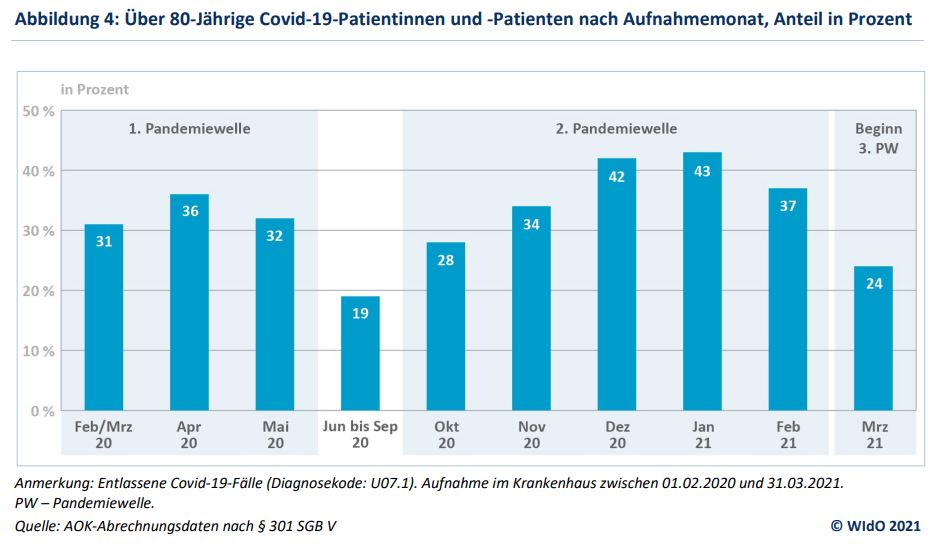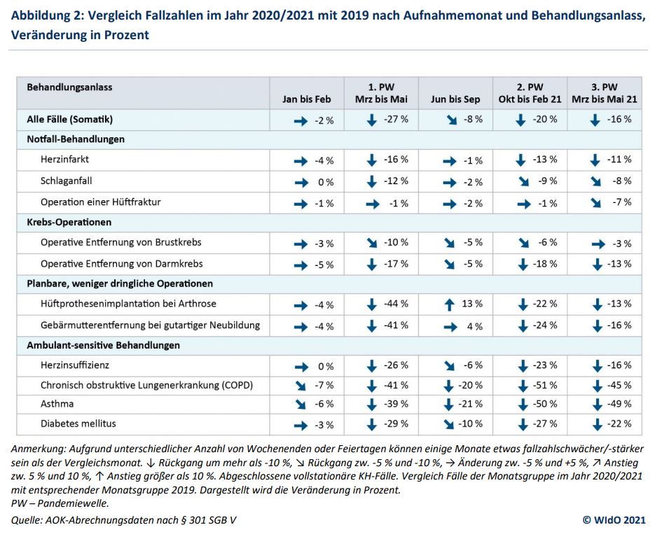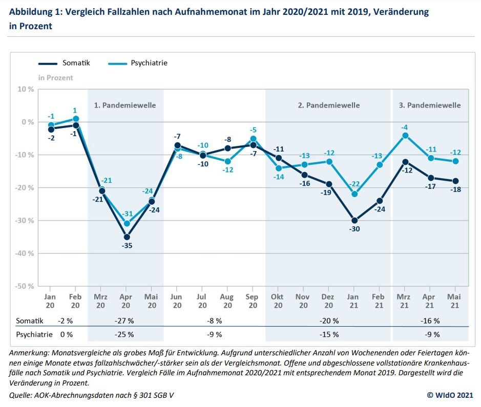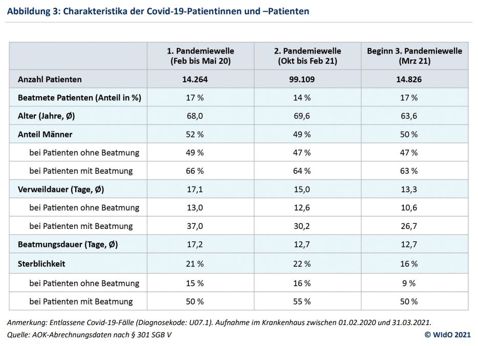 WIdO-Analyse: Auch in der dritten Pandemiewelle Fallzahlrückgänge in deutschen Kliniken30. Juli 2021 Foto: ©sudok1 – stock.adobe.com Auch in der dritten Pandemiewelle wurden in deutschen Krankenhäusern weniger Behandlungen durchgeführt, der Rückgang war jedoch geringer als in den ersten beiden Wellen. Das zeigt eine aktuelle Auswertung des Wissenschaftlichen Instituts der AOK (WIdO) auf Basis der Daten von stationär behandelten AOK-Versicherten. Danach lag die Gesamt-Fallzahl in diesem Frühjahr (März bis Mai 2021) 16 Prozent niedriger als im Vergleichszeitraum 2019. Im Juni 2021 liegen die Fallzahlen nur noch 5 Prozent unter dem Niveau von Juni 2019. In der zweiten Welle (Oktober 2020 bis Februar 2021) betrug der Rückgang noch minus 20 Prozent, in der ersten Welle im Frühjahr 2020 (März bis Mai) sogar minus 27 Prozent (Abbildung 1). Verschiedene Indikationen unterschiedlich stark betroffen Auffällig ist die Entwicklung bei den sogenannten ambulant-sensitiven Krankheitsbildern: „Bei Krankenhausbehandlungen zu Indikationen wie Diabetes, Herzinsuffizienz oder der chronischen Lungenerkrankung COPD, die auch von entsprechend qualifizierten niedergelassenen Ärzten behandelt werden können, sehen wir weiterhin sehr starke Einbrüche von bis zu 50 Prozent“, berichtet WIdO-Geschäftsführer Jürgen Klauber. Die aktuelle Auswertung macht zudem sichtbar, dass COVID-19-Erkrankte, die zu Beginn der dritten Welle in den deutschen Kliniken behandelt wurden, im Schnitt jünger waren als die Patientinnen und Patienten in den vorangegangenen Pandemiewellen. Die Analyse zeigt je nach Indikation unterschiedlich starke Veränderungen der Fallzahlen. So ist bei den Brustkrebs-Operationen in der dritten Welle von März bis Mai 2021 eine weitgehende Rückkehr zu den Fallzahlen vor der Pandemie festzustellen. Bei den Darmkrebs-Operationen beobachtet das WIdO dagegen erneut einen Rückgang: Hier lagen die Fallzahlen in diesem Zeitraum immer noch 13 Prozent niedriger als im Vergleichszeitraum 2019 (Abbildung 2). In der ersten Pandemiewelle von März bis Mai 2020 war bei den Darmkrebs-Operationen ein Minus von 17 Prozent gegenüber 2019 zu verzeichnen gewesen, in der zweiten Welle waren es minus 18 Prozent. „Wir vermuten, dass der Rückgang der Darmkrebs-Operationen mit reduzierter vorgelagerter Diagnostik im ambulanten Bereich zusammenhängt. Koloskopien zur Erkennung von Darmkrebs wurden in der ersten Pandemiewelle deutlich seltener durchgeführt. Für die Folgewellen liegen uns die Zahlen aus der ambulanten Versorgung allerdings noch nicht vor“, so Klauber. Auch die Fallzahlen für die Behandlung von Notfällen wie Schlaganfällen und Herzinfarkten liegen in der dritten Pandemiewelle weiterhin unter dem Niveau der Vorpandemiezeit (minus 11 Prozent bei Herzinfarkten, minus 8 Prozent bei Schlaganfällen, Abbildung 2). „Hier stellt sich weiter die Frage, ob damit ein Versorgungsproblem verbunden ist. Auf jeden Fall gilt der Appell an die Patientinnen und Patienten, im Notfall ohne Zögern den Notruf zu alarmieren“, so Klauber. Deutlich geringere Rückgänge bei planbaren Operationen Bei den planbaren Operationen gab es in der dritten Welle deutlich geringere Rückgänge als in den beiden ersten Wellen (Abbildung 2). Wegen der politisch verordneten Verschiebung von weniger dringlichen Eingriffen waren die Fallzahlen hier zu Beginn der Pandemie sehr stark eingebrochen. „Bei den Hüftimplantationen beispielsweise sehen wir zuletzt nur noch einen Rückgang von 13 Prozent gegenüber dem Vergleichszeitraum im Frühjahr 2019.“ In der ersten Pandemiewelle waren es noch minus 44 Prozent, in der zweiten Welle minus 22 Prozent. Umso bemerkenswerter ist die Entwicklung bei den ambulant-sensitiven Diagnosen (Abbildung 2): Bei der chronisch-obstruktiven Lungenerkrankung COPD ist in der dritten Welle wieder ein Einbruch von 45 Prozent zu verzeichnen – ähnlich wie in der zweiten Welle (minus 51 Prozent). Vergleichbar starke Fallzahlrückgänge gab es bei der Behandlung von Asthma. Bei Diabetes und Herzinsuffizienz lagen die Rückgänge in der dritten Welle bei 22 beziehungsweise 16 Prozent und damit etwas geringer als in der zweiten Welle (minus 27 beziehungsweise 23 Prozent). „Die Zahlen sind ja schon zu Beginn der Pandemie deutlich gesunken und haben selbst im letzten Sommer trotz des sehr niedrigen Infektionsgeschehens nicht mehr das Niveau des Jahres 2019 erreicht“, sagt Jürgen Klauber. „Möglicherweise befördert die Pandemie hier einen grundlegenden Strukturwandel in der Versorgung ambulant-sensitiver Fälle. Deutschland hat im europäischen Vergleich einen sehr hohen Anteil solcher Fälle, die im Krankenhaus behandelt werden, während dies in anderen Ländern schon deutlich länger ambulant funktioniert.“ Verweildauer und Dauer der Beatmung bei COVID-19-Erkrankten gesunken Eine aktuelle Auswertung der Abrechnungsdaten zur stationären Behandlung der AOK-Versicherten mit einer COVID-19-Erkankung zeigt die Entwicklung in der zweiten Pandemiewelle (Oktober 2020 bis Februar 2021) und erste Trends für den Beginn der dritten Welle im März 2021. Im Verlauf der Pandemie weisen die Daten geringfügige Verschiebungen auf (Abbildung 3). So sank der Anteil der beatmeten Covid-19-Erkrankten im Krankenhaus von 17 Prozent in der ersten Welle (Februar bis Mai 2020) leicht auf 14 Prozent in der zweiten Welle. Zuletzt lag er im März 2021 wieder bei 17 Prozent. Auffällig ist die sinkende Verweildauer der Betroffenen im Krankenhaus: Diese lag zu Beginn der Pandemie bei durchschnittlich 17,1 Tagen, in der zweiten Welle dann nur noch bei 15,0 Tagen. Auch die Dauer der Beatmung sank von 17,2 Tagen zu Beginn der Pandemie auf 12,7 Tage in der zweiten Welle; zuletzt lag sie im März 2021 bei 12,7 Tagen. Durchschnittsalter der COVID-19-Erkrankten in der dritten Welle deutlich niedriger Das Durchschnittsalter der Patientinnen und Patienten war in der zweiten Welle mit 69,6 Jahren etwas höher als in der 