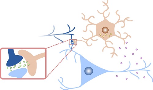 Wie Astrozyten das flexible Lernen fördern25. Juli 2024 v.l.n.r.: Dr. Pietro Verzelli, Prof. Tatjana Tchumatchenko und Lorenzo Squadrani haben das Rätsel um die Rolle von Astrozyten für Lernprozesse und Gedächtnis im Gehirn gelöst. (Foto: © Rolf Müller / Universitätsklinikum Bonn) Forschende des Universitätsklinikums Bonn (UKB) und der Universität Bonn haben anhand eines biophysikalischen Modells aufgeklärt, wie Astrozyten im Wechselspiel mit Nervenzellen die schnelle Anpassung des Gehirns an neue Informationen regulieren.1 Für Lernen und Gedächtnis ist die synaptische Plastizität des Gehirns von grundlegender Bedeutung. Bei ihrer Erforschung hat sich die Wissenschaft traditionell auf Nervenzellen und ihre Synapsen konzentriert. Erst die Entdeckung der intrazellulären Ca2+-Signalübertragung in Astrozyten führte zu der Idee, dass diese Zellen mehr sind als ein das Gehirn zusammenzuhaltender Klebstoff und für die Funktion des Gehirns eine entscheidende Rolle spielen. „Eine Funktionsstörung der Astrozyten kann unsere Lernfähigkeit erheblich beeinträchtigen, was ihre Bedeutung für kognitive Prozesse unterstreicht. Die genauen Funktionen der Astrozyten blieben jedoch lange Zeit ein Rätsel“, beschreibt Korrespondenz- und Co-Seniorautorin Prof. Tatjana Tchumatchenko, Forschungsgruppenleiterin am Institut für Experimentelle Epileptologie und Kognitionsforschung des UKB und Mitglied im Transdisziplinären Forschungsbereich (TRA) „Modelling“ der Universität Bonn, die Motivation ihrer Forschungsgruppe, dieser Frage nachzugehen.Komplizierter Tanz zellulärer Interaktionen beim Lernen enträtselt„Unsere Arbeit als computergestützte Neurowissenschaftler besteht darin, die Sprache der Mathematik zu verwenden, um die experimentellen Beobachtungen zu interpretieren und kohärente Modelle des Gehirns zu erstellen“, erklärt Co-Seniorautor Dr. Pietro Verzelli, ein Postdoktorand aus der Gruppe um Tchumatchenko. In diesem Fall entwickelten die Forscher ein biophysikalisches Modell des Lernens, das auf einer biochemischen Rückkopplungsschleife zwischen Astrozyten und Neuronen beruht, die kürzlich von Dr. Kirsten Bohmbach, Prof. Christian Henneberger und anderen Forschenden am DZNE und UKB entdeckt wurde.2 Das errechnete Modell erweitert die Kommunikation zwischen zwei Neuronen um einen dritten Akteur, den Astrozyten. Endocannabinoide vom postsynaptischen Neuron binden an Astrozytenrezeptoren und verändern die D-Serin-Konzentration. (Quelle: © Tchumatchenko Gruppe / Universitätsklinikum Bonn) Das biophysikalische Modell erklärt die Lerndefizite, die bei Mäusen mit gestörter astrozytärer Regulation beobachtet wurden, und unterstreicht die entscheidende Rolle, die Astrozyten bei der schnellen Anpassung an neue Informationen spielen. Indem sie den Spiegel des Neurotransmitters D-Serin regulieren, können Astrozyten die Fähigkeit des Gehirns erleichtern, seine synaptischen Verbindungen effizient anzupassen und neu zu verdrahten. „Unser mathematischer Rahmen erklärt nicht nur die experimentellen Beobachtungen, sondern liefert auch neue überprüfbare Vorhersagen über den Lernprozess“, berichtet Doktorand und Erstautor Lorenzo Squadrani.Damit schließt die Forschungsarbeit den Wissenschaftlern zufolge die Lücke zwischen theoretischen Modellen der Plastizität und experimentellen Erkenntnissen über die Interaktionen zwischen Nerven- und Gliazellen. Sie hebt die astrozytäre Regulation als physiologische Grundlage für dynamische synaptische Anpassungen hervor, ein zentrales Konzept der synaptischen Plastizität. „Unsere Ergebnisse tragen zu einem besseren Verständnis der molekularen und zellulären Mechanismen bei, die dem Lernen und dem Gedächtnis zugrunde liegen, und bieten neue Möglichkeiten für therapeutische Eingriffe, die auf Astrozyten abzielen, um kognitive Funktionen zu verbessern“, erklärt Tchumatchenko.