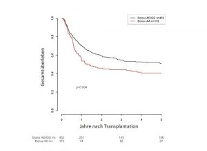Wie Blutstammzelltransplantation unter nicht verwandten Menschen verbessert werden kann11. Oktober 2022 Abb. 1: Unterschied beim Anteil der überlebenden Transplantatempfängern ohne DRB3/4/5 Differenz (schwarz) gegenüber Transplantatempfängern mit DRB3/4/5 Differenz (rot) in Abhängigkeit von der Zeit nach Transplantation in Jahren. Grafik: © Daniel Fürst Forschende vom Universitätsklinikum Ulm und dem DRK-Blutspendedienst Baden-Württemberg – Hessen untersuchen genetische Merkmale, die die Verträglichkeit von Patientin und Spender bei der Blutstammzelltransplantation unter nicht verwandten Menschen beeinflussen können und haben hierbei neue Zusammenhänge entdeckt. Das Projekt wurde von der Wilhelm Sander-Stiftung gefördert und in 2021/22 publiziert. Die Blutstammzelltransplantation gibt Betroffenen mit lebensbedrohlichen Erkrankungen des Knochenmarks die Chance auf Heilung. Die Transplantation von Blutstammzellen ist jedoch eine eingreifende Behandlung mit einer Vielzahl von Komplikationsmöglichkeiten, welche die Lebensqualität stark einschränken können. Durch Auswahl möglichst gut passender Spender können diese Komplikationen reduziert werden. Über die Jahre konnten die Überlebensraten der Betroffenen durch Optimierung der Spenderauswahl verbessert werden. Die Analyse von genetischen Merkmalen von Spender:innen und Betroffenen gibt Aufschluss über deren Einfluss auf die Gewebeverträglichkeit. Die Forschenden um Dr. Daniel Fürst, Dr. Joannis Mytilineos und Prof. Dr. Hubert Schrezenmeier aus dem Institut für Klinische Transfusionsmedizin und Immungenetik Ulm (IKT) und dem Universitätsklinikum Ulm arbeiten daran, diese Erkenntnisse zu erweitern. Hierfür untersuchten sie genetische Merkmale, die in Zukunft dabei helfen könnten, besser passende Spender auszuwählen.Differenzen bei Spenderauswahl vermeidenGrundsätzlich ist bei der Auswahl von Stammzellspendern eine Übereinstimmung der jeweiligen Gewebemerkmale von Patient und Spender günstig. Die wichtigsten sind die HLA-Merkmale. Bei HLA (Humane Leukozyten-Antigene) handelt es sich um Strukturen auf der Oberfläche der Körperzellen, durch die unser Immunsystem zwischen eigenem und fremden Gewebe unterscheiden kann. Für das HLA-Merkmal HLA-DPB1 kann jedoch häufig kein identischer Spender gefunden werden, so dass Modelle entwickelt wurden, die die Verträglichkeit unterschiedlicher HLA-DPB1 Merkmale vorhersagen können. Die wichtigsten Modelle sind das T Zell Epitop und das HLA-DPB1 Expressionsmodell. Diese Modelle wurden an einer großen Kohorte von deutschen Betroffenen untersucht. Hier konnte gezeigt werden, dass beide Modelle unabhängig voneinander gültig sind und zusammen betrachtet werden müssen. Zusätzlich wurde das Vorhandensein von zwei HLA-DPB1 Differenzen als weiterer Risikofaktor bestätigt. Diese Erkenntnisse ermöglichen es, genetische Risikokombinationen für das Merkmal HLA-DPB1 zu vermeiden, die mit erhöhter transplantationsbedingter Sterblichkeit einhergehen.Die HLA-DRB3/4/5-Gene sind weitere Parameter aus der Familie der klassischen HLA-Gewebemerkmale. Es gab bereits aus anderen Studien erste Hinweise, dass Unterschiede in diesen Genen zwischen Patient und Spender mit erhöhten Komplikationsraten nach Stammzelltransplantation einhergehen. Bislang werden diese Merkmale nicht in die Spenderauswahl miteinbezogen. Auch wenn Patient und Spender bezüglich der anderen HLA-Gene komplett identisch sind, treten dennoch in einem relevanten Anteil der Fälle (12,5 %) Unterschiede in den HLA-DRB3/4/5 Genen auf. Bei einem entsprechenden Unterschied war die Sterblichkeitsrate gegenüber Fällen ohne Unterschied um 25 % erhöht (Abb. 1). „Daher raten wir, entsprechende Differenzen bei der Spenderauswahl zu vermeiden“, resümiert Fürst.Zusammenspiel von bestimmten Erbgut-Merkmal mit HLA-Merkmal Abb. 2: Unterschied beim Anteil überlebender Patienten mit günstigem rs2204985 Merkmal beim Spender (schwarz) im Vgl. zu ungünstigem Merkmal (rot ) in Abhängigkeit von der Zeit nach Transplantation in Jahren in der Gruppe der Transplantationspaare mit einer HLA-Differenz. Grafik: © Daniel Fürst Ein Merkmal im Erbgut mit der Bezeichnung rs2204985 beeinflusst die Reifung von weißen Blutkörperchen. Rund ein Viertel der Menschen weisen eine Variation in diesem Merkmal auf, die zu einer weniger breit gefächerten Ausreifung des Immunsystems führt. Dies hat für gesunde Spender vermutlich keine Bedeutung, scheint jedoch im Rahmen einer Blutstammzelltransplantation für Betroffene eine große Auswirkung zu haben, wenn zusätzlich zu dieser genetischen Eigenschaft noch eine HLA-Differenz vorliegt. Anhand einer großen Gruppe von Transplantationspaaren konnte festgestellt werden, dass das Sterblichkeitsrisiko um 48 % erhöht ist, während bei Spendern, die das entsprechende Merkmal nicht aufweisen das Sterblichkeitsrisiko nur unwesentlich höher ist als bei komplett passenden (Abb. 2). Dieses genetische Merkmal könnte folglich für Betroffene, für die kein komplett passender Spender verfügbar ist, dazu beitragen, die bestmögliche Stammzellenspende zu finden und somit die Erfolgsaussichten einer Transplantation zu verbessern.In einer weiteren Untersuchung konnte gezeigt werden, dass Differenzen im HLA-G-Gen, das aktuell nicht routinemäßig bestimmt wird, nach Transplantation zu einem signifikant höheren Risiko für eine unerwünschte chronische Immunrektionen des sich bildenden neuen Immunsystems führt. Dieses greift dann eigentlich gesunde Patientenzellen an. Nach Blutstammzelltransplantation ist in der Regel immer eine zumindest zeitweise Unterdrückung des Immunsystems notwendig. Diese Erkenntnis könnte bei der Auswahl von geeigneten Medikamenten zur Behandlung und Prävention solcher unerwünschter Immunreaktionen unterstützen.Wilhelm Sander-Stiftung: Partnerin innovativer KrebsforschungDie Wilhelm Sander-Stiftung hat das Forschungsprojekt mit insgesamt knapp 163.000 Euro über 24 Monate unterst