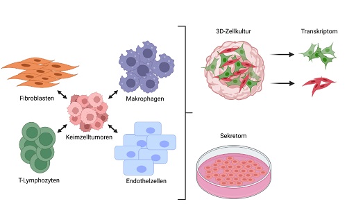 Wie die Kommunikation von Hodentumoren mit dem umliegenden Mikromilieu den Therapieerfolg beeinflusst20. Juli 2022 Fluoreszenzaufnahme der Interaktion von Keimzelltumor-Zellen (grün) und Endothelzellen (rot) in einem 3D-Kultursystem (Zellkerne blau). Die linke Hälfte zeigt die einzelnen Zellpopulationen, die rechte Seite deren Interaktion. Aufnahme: © HHU / Daniel Nettersheim Forschende des Universitätsklinikums Düsseldorf untersuchen den Einfluss des Tumor-Mikromilieus auf die Resistenzentwicklung bei der Cisplatin-basierten Chemotherapie von Hodentumoren. Testikuläre Keimzelltumoren, auch Hodentumoren genannt, treten insbesondere bei jungen Männern im Alter von 15 – 45 Jahren auf. Insbesondere in westlichen Ländern steigt die Anzahl der Neuerkrankungen stetig – hier werden Umwelteinflüsse, wie z. B. die Exposition gegenüber Chemikalien, die hormonähnlich wirken, als Ursache vermutet. Im klinischen Alltag werden diese Patienten in der Regel mit der chirurgischen Entfernung des Hodens und einer Cisplatin-basierten Chemotherapie behandelt. Obwohl die Heilungschancen durch die Chemotherapie sehr vielversprechend sind, erleiden bis zu 15 % der Patienten einen Rückfall aufgrund einer Therapie-Resistenzentwicklung, welche mit einer verminderten Überlebenswahrscheinlichkeit assoziiert ist. Die genauen molekularen Ursachen, die zu der Entstehung einer Cisplatin-Resistenz führen können, sind jedoch trotz der fast 50-jährigen Erfahrung in der Klinik weiterhin nur unzureichend aufgeklärt. Die Sensitivität von Tumorzellen gegenüber der Chemotherapie kann durch die um den Tumor umliegenden Immun- oder Bindegewebszellen (z. B. Fibroblasten) beeinflusst werden. Diese werden dem Tumor-Mikromilieu zugeordnet. Aufgrund des direkten Austauschs von Signalproteinen und Wachstumsfaktoren können somit die Zellen des Mikromilieus die Cisplatin-Sensitivität der Tumorzellen negativ beeinflussen. Das Forscherteam um Prof. Daniel Nettersheim hat diese Interaktion zwischen Keimzelltumor-Zellen und Mikromilieu-Komponenten in einem 3D-Modellsystem detailliert analysiert, um neue therapeutische Zielmoleküle und Signalkaskaden zu identifizieren sowie die molekulare Kommunikation dieser Tumor-Mikromilieu-Interaktion zu verstehen. Basierend auf massenspektrometrischen Messungen ist die Gesamtheit der sekretierten Faktoren der Tumor- und Mikromilieu-Zellen, das Sekretom, erfasst worden. Außerdem untersuchten die Forschenden die Veränderungen im Transkriptom (Gesamtheit aller RNA-Moleküle) nach direktem Zell-Zell-Kontakt in einem 3D-Kultursystem. Hier zeigten sie, dass insbesondere die Interaktion von Keimzelltumor-Zellen mit Fibroblasten oder Endothelzellen die Sensitivität gegenüber Cisplatin reduziert. So wurden entsprechende Signalwegsmoleküle, die in der Resistenzentwicklung eine Rolle spielen könnten, identifiziert. Zudem wiesen sie nach, dass Bestandteile der extrazellulären Matrix, wie Kollagene und Fibronektine, die Cisplatin-Sensitivität in den Tumorzellen vermindern, während tumorfördernde Eigenschaften, wie Migration und Adhäsion, verstärkt wurden. Vereinfachte Zusammenfassung des Aufbaus der Studie. Veränderungen im Transkriptom wurden nach 3D-Co-Kultur untersucht. Das Sekretom der Zellpopulationen wurde mittels Massenspektrometrie vermessen. Erstellt mit BioRender.com.Abbildung: © HHU / Daniel Nettersheim „Die Ergebnisse dieser Studie verdeutlichen den starken Einfluss des Mikromilieus auf die Keimzelltumoren sowie den Therapieerfolg und zeigen, dass diese Tumor-Mikromilieu-Interaktion in weiteren Forschungsprojekten adressiert werden muss“, fasst Nettersheim die Studienergebnisse zusammen, welche in der Fachzeitschrift “Molecular Oncology” frei zugänglich publiziert wurden. „Dieses Projekt verdeutlicht zudem wie wichtig die wissenschaftliche Kooperation ist und wie Projekte gemeinsam wachsen können“ führt Dr. Margaretha Skowron, Erstautorin der Studie, weiter aus. In diesem Forschungsprojekt kooperierten Forschende der Universitätsklinika Düsseldorf, Bonn, Ulm und Essen. Entscheidende Analysen wurden in enger Zusammenarbeit mit den „Core Facilities“ „Molecular Proteomics Laboratory“ und „Genomics & Transcriptomics“ des Biologisch-Medizinisches Forschungszentrums (BMFZ), der „Core Flow Cytometry Facility“ und des „Center for Advanced Imaging“ der Heinrich-Heine-Universität Düsseldorf durchgeführt. Vice versa wird zukünftig ein Fokus der Forschenden auf dem Einfluss der Tumorzellen auf die Mikromilieu-Zellen liegen. Hier im Besonderen auf den Fibroblasten, um die Prozesse aufzuklären, die zu einer Aktivierung dieser Fibroblasten zu krebsassoziierten Fibroblasten führen und die Zellen so verändern, dass sie das Tumorwachstum unterstützen.
