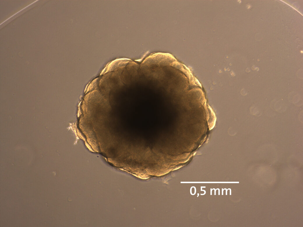 Wie ist das große Gehirn entstanden?27. März 2025 Ausschnitt eines elektroporierten, genetisch veränderten Schimpansen-Gehirnorganoids. In blau Zellkerne, in magenta Vorläuferzellen, in grün elektroporierte, genetisch veränderte Zellen und in orange sich teilende Zellen. Foto: © Nesil Esiyok/ Deutsches Primatenzentrum GmbH Zwei spezifische Gene, die ausschließlich beim Menschen vorkommen, beeinflussen gemeinsam die Entwicklung des Großhirns. Das haben Forschende des Deutschen Primatenzentrums – Leibniz-Institut für Primatenforschung und des Max-Planck-Instituts für molekulare Zellbiologie und Genetik herausgefunden. Damit ist ihnen der Nachweis gelungen, dass diese Gene gemeinsam zur evolutionären Vergrößerung des Gehirns beitragen (Science Advances). Die Studienergebnisse zeigen, dass die beiden Gene in einem fein abgestimmten Zusammenspiel wirken: Eines sorgt dafür, dass sich die Vorläuferzellen des Gehirns stärker vermehren, während das andere bewirkt, dass sich diese Zellen in einen anderen Vorläuferzelltyp umwandeln – jene Zellen, die später die Nervenzellen des Gehirns bilden. Dieses Zusammenwirken hat im Laufe der Evolution dazu geführt, dass das menschliche Gehirn in seiner Größe und Komplexität einzigartig ist. Die neu gewonnenen Erkenntnisse bieten nicht nur Einblicke in die evolutionäre Entwicklung unseres Gehirns, sondern könnten auch helfen, besser zu verstehen, wie bestimmte Entwicklungsstörungen oder Erkrankungen des Gehirns entstehen. „Unsere Ergebnisse vertiefen das grundlegende Verständnis der Gehirnentwicklung und liefern neue Einblicke in die stammesgeschichtliche Entstehung unseres großen Gehirns. Langfristig könnten sie zur Entwicklung therapeutischer Ansätze für Fehlbildungen des Gehirns beitragen“, sagt Nesil Eşiyok, Erstautorin der Studie. Gehirnorganoid eines Schimpansen, das 14 Tage in Kultur gewachsen ist. Foto: © Lidiia Tynianskaia/ Deutsches Primatenzentrum GmbH Für die Studie wurden verschiedene Methoden kombiniert: Neben Tierversuchen mit Mäusen kamen auch Alternativmethoden wie Gehirnorganoide des Schimpansen zum Einsatz. „Das besondere an unserer Studie ist, dass sich die Ergebnisse aus Tierversuchen und Alternativmethoden ideal ergänzen und gegenseitig bestätigen. Das unterstreicht nicht nur die hohe Aussagekraft unserer Ergebnisse, sondern könnte auch dazu beitragen, in Zukunft den Bedarf an Tierversuchen zu verringern, indem Alternativmethoden weiterentwickelt, verfeinert und bestätigt werden“, erklärt Michael Heide, Hauptverantwortlicher der Studie.