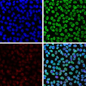 Wie resistente Krebszellen bekämpft werden können1. August 2018 Analyse von DNA-Reparaturmechanismen in Zellen per Fluoreszenz-Mikroskopie. Foto: © Conrad von Schubert Ein internationales Forschungsteam unter der Co-Leitung der Universität Bern und des Niederländischen Krebsforschungszentrums (NKI) hat verschiedene Mechanismen der Krebstherapieresistenz entschlüsselt. Die Erkenntnisse tragen dazu bei, die Selbst-Reparatur von Krebszellen nach einer Therapie zu verstehen und somit resistente Tumore effizienter zu bekämpfen. Die DNA in unseren Zellen ist ständig Schädigungen ausgesetzt, welche insbesondere durch den normalen Stoffwechsel der Zellen verursacht werden. Aktuelle Schätzungen gehen von bis zu 70.000 Schädigungen pro Zelle pro Tag aus. Diese Schäden können gesunde Zellen aber reparieren, zum Beispiel mit Hilfe der Proteine BRCA1 und BRCA2. Wenn diese allerdings defekt sind, kommt es zu einer vermehrten Anzahl von DNA-Mutationen, die Krebs verursachen können. Vor allem die Entstehung von Brust- und Eierstockkrebs wird mit Schäden an diesen beiden Reparatur-Proteinen in Verbindung gebracht. Resistente Zellen mit wiederhergestellter DNA-Reparatur. Blau: DNA in Zellkernen, Grün: PAR-Ketten (Plattform für DNA-Reparaturproteine), Rot: rekrutierte DNA-Reparaturproteine, und Mix aller 3 Farben Bild: © Universität Bern Tumore, die einen solchen Defekt aufweisen, können mit Hilfe einer neuen Therapie mit PARP-Inhibitoren bekämpft werden. Wenn das Protein PARP, das ebenfalls an der DNA-Reparatur beteiligt ist, zusätzlich zu den defekten Reparatur-Proteinen blockiert wird, sterben die Krebszellen ab, während die gesunden Körperzellen (mit noch funktionierenden Reparatur-Proteinen) überleben. Trotz des klinischen Erfolgs der PARP-Inhibitoren kommt es bei Patientinnen und Patienten aber leider häufig zur Entstehung einer Resistenz. Die genauen Ursachen dieser Resistenz sind noch unklar. In enger Zusammenarbeit mit dem Netherlands Cancer Institute (NKI) in Amsterdam (Jonkers Labor), dem Institute of Cancer Research in London (Lord Labor), dem Lunenfeld-Tanenbaum Research Institute in Toronto (Durocher Labor) und dem Genome Integrity Laboratory in Oxford (Chapman Labor) hat ein Forschungsteam der Universität Bern nun drei verschiedene Resistenzmechanismen gegen diese PARP-Inhibitoren identifiziert. Die Erkenntnisse können dazu verwendet werden, neue Ansätze gegen Therapieresistenzen zu entwickeln. Durch diese Forschung wurden auch neue Einsichten in grundsätzliche Mechanismen der DNA-Reparatur gewonnen. Die Resultate wurden in den Fachzeitschriften «Cancer Cell», «Cell Reports» und «Nature» publiziert. Millionen von Krebszellen untersucht Mit Hilfe der Genschere CRISPR/Cas9 und der zielgerichteten Abschaltung von Genen konnten die Forschenden herausfinden, welche Gene die DNA-Reparatur im Zusammenhang mit der Krebstherapie steuern. Sie modifizierten Millionen von BRCA-mutierten Krebszellen genetisch, wobei sie im Durchschnitt nur 1 Gen pro Zelle veränderten. Nachdem diese Millionen von Zellen dann mit PARP-Inhibitoren behandelt wurden, blieben jene Zellen übrig, die aufgrund bestimmter genetischer Veränderungen resistent wurden und die Behandlung überlebten. «Die Veränderungen in diesen Zellen gaben uns dann einen Hinweis, welche Gene in der Resistenzentwicklung involviert sind», sagt Sven Rottenberg von der Vetsuisse-Fakultät der Universität Bern. Hierzu kultivierten die Forschenden die Tumorzellen auch in einer dreidimensionalen Matrix, was den Vorteil bietet, dass diese Zellkulturen den echten Tumoren ähnlicher sind. Mit Hilfe dieser Tests entdeckten die Forscher, dass der Erfolg der PARP-Inhibitoren von der Funktion weiterer Proteine, die ebenfalls bei der Reparatur von DNA-Brüchen involviert sind, abhängig ist. Fällt die Funktion dieser zum Teil neu entdeckten Proteine aus, kommt es zur Resistenz gegen die PARP-Inhibitoren. Achillesferse der Tumore nutzen Durch das Verständnis der genauen Resistenzmechanismen ergeben sich neue Chancen: «In unseren Modellen haben wir gesehen, dass die Tumore, die gegen eine Behandlung durch PARP-Inhibitoren resistent sind – aufgrund des Ausfalls von weiteren DNA-Reparatur-Proteinen – durch Radiotherapie oder bereits etablierte Krebsmedikamente wie Temozolamid bekämpft werden können. Dies eröffnet Therapiemöglichkeiten für Patientinnen und Patienten, bei denen der Krebs nach einer anfänglich erfolgreichen PARP-Inhibitor-Behandlung erneut auftritt», erklärt Rottenberg. Seine Forschungsgruppe arbeitet daran, weitere Schwachstellen der resistenten Tumore zu finden, mit der Hoffnung, neue Therapieansätze zu entwickeln und die Resistenz von Krebs, der aufgrund defekter Reparatur-Proteine entsteht, zu überwinden. Die Forschung von Sven Rottenberg wird unterstützt vom Schweizer Nationalfonds (SNF), der Krebsliga Schweiz, der Niederländischen Krebsliga (KWF), sowie der EU (European Research Council, ERC). Die vorliegende Studie ist eine Zusammenarbeit der Universität Bern mit dem Netherlands Cancer Institute (NKI) in Amsterdam (Jonkers und Wessels Labore), dem Institute of Cancer Research in London (Lord Labor), dem Lunenfeld-Tanenbaum Research Institute in Toronto (Durocher Labor) und der Universität Zürich (Lopes Labor), des Danish Cancer Society Research Center in Kopenhagen und Karolinksa Institutes in Stockholm (Bartek Labore), der University of Oxford (Chapman und Tarsounas Labore), der University of Manchester (Ogilvie Labor), der University of Leiden (van Attikum Labor), und der University of Groningen (van Vugt Labor). Publikationen: Gogola E, Duarte AA, de Ruiter JR, Wiegant WW, Schmid JA, James DI, Guerrero Llobet S, Vis DJ, Annunziato S, van den Broek B, Barazas M, Kersbergen A, de Bruijn R, van de Ven M, Tarsounas M, Ogilvie DJ, van Vugt M, Wessels LFA, Bartkova J, Gromova I, Andújar Sánchez M, Bartek J, Lopes M, van Attikum H, Borst P, Jonkers J, Rottenberg S. Selective loss of PAR