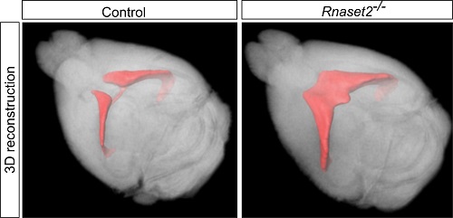 Wie schädigt zuviel Interferon das Gehirn von ungeborenen Kindern?10. Februar 2022 Erst- und Senior-Autoren der Publikation (v.l.): Dr. Stefan Nessler (Institut für Neuropathologie), Prof. Jutta Gärtner, Dr. Matthias Kettwig und Dr. Katharina Ternka (alle Klinik für Kinder- und Jugendmedizin), Universitätsmedizin Göttingen. (Foto: umg) Forscher der Universitätsmedizin Göttingen (UMG) erstellen das erste Tiermodell, mit dem schädigende Mechanismen von übermäßiger Interferonausschüttung auf das Gehirn untersucht werden können. Interferon ist der wichtigste Botenstoff, mit dem das angeborene Immunsystem die Abwehr gegen Virusinfektionen einleitet. Interferon löst in nahezu allen Körperzellen eine Reihe von Programmen aus, die der Zerstörung eines eingedrungenen Virus dienen. Bei einer übermäßigen Ausschüttung von Interferon im Rahmen einer Virusinfektion während der Schwangerschaft kann es jedoch beim ungeborenen Kind zu einer beträchtlichen Schädigung des Gehirns kommen. So können beispielsweise Infektionen mit dem Cytomegalie Virus (CMV) zur Folge haben, dass Kinder nach der Geburt von einer schweren geistigen Behinderung, epileptischen Anfällen und einer ausgeprägten Spastik betroffen sind. Zu einer starken Interferonausschüttung kommt es ebenfalls bei einer Reihe von genetisch-bedingten Erkrankungen. Bei den sogenannten Interferonopathien sind Defekte im Nukleinsäure-Stoffwechsel (RNA und DNA) der Zellen die Ursache. Zu dieser Erkrankungsgruppe gehört die sogenannte RNASET2-defiziente zystische Leukenzephalopathie. Die Erkrankung wurde erstmals im Jahr 2009 durch Kinderärzte der Universitätsmedizin Göttingen (UMG) erkannt und beschrieben. Einem Göttinger Forscherteam um Dr. Matthias Kettwig, Klinik für Kinder- und Jugendmedizin der UMG ist es nun erstmals gelungen, ein Mausmodell für die RNASET2-Erkrankung zu entwickeln. Mithilfe des Tiermodells der Erkrankung konnten erste detaillierte, wissenschaftliche Einblicke in eine Interferon-vermittelte Entzündung des Gehirns gewonnen werden. Das Modell ist bisher das einzige für die Gruppe der Interferonopathien, das eine Beteiligung des Gehirns aufweist. Es stellt damit die Grundlage dar für die Entwicklung von wirksamen Therapien nicht nur für diese seltene genetische Erkrankungsgruppe, sondern auch für hirnschädigende Virusinfektionen während der Schwangerschaft. Forschungsergebnisse im Detail In ausführlichen Untersuchungen mit dem neuen Tiermodell für die RNASET2-defiziente zystische Leukenzephalopathie konnten die Göttinger Forscher eine ausgeprägte Entzündungsreaktion in vielen Organen feststellen. Dabei fanden sie auch Störungen in der Blutbildung (Anämie und Thrombozytopenie), wie sie häufig bei Patienten dieser Erkrankungsgruppe gesehen werden. Am ausgeprägtesten war die Entzündungsreaktion im Gehirn. Hier konnten die Forscher nachweisen: Entzündungszellen, wie CD8+-T-Zellen und entzündliche Monozyten, wandern in nahezu alle Bereiche des Gehirns ein. MRT-Aufnahme des Gehirns einer Rnaset2-/- Maus und eines Kontrolltieres. Zu sehen ist die deutliche Größenzunahme der Nervenwasserkammern (Ventrikel, rot). Dies ist ein indirektes Zeichen für die Abnahme des Hirnvolumens der Rnaset2-/- Mäuse. (Abb.: Abteilung Funktionelle Bildgebung des DPZ, Leitung: S. Boretius) „CD8+-T-Zellen werden bei vielen entzündlichen und abbauenden Hirnerkrankungen gesehen. Wir waren jedoch erstaunt über die Anzahl der eingewanderten Zellen im Vergleich zu anderen Erkrankungen“, sagt Dr. Stefan Nessler, wissenschaftlicher Mitarbeiter des Instituts für Neuropathologie der UMG und einer der Seniorautoren des Artikels. Die Forscher stellten zudem fest: Die Einwanderung dieser Entzündungszellen wird von weiteren Entzündungszeichen begleitet. In Untersuchungen der Mäuse mit Magnetresonanztomographie (MRT) zeigte sich eine für eine deutliche Entzündung des Gewebes typische Kontrastmittelaufnahme und Verlängerung der T2-Relaxation sowie eine deutliche Abnahme der Hirnmasse, die im Hippocampus besonders ausgeprägt war. „So war es für uns nicht verwunderlich, dass sich auch die Gedächtnisfunktion bei den Tieren verschlechterte“, sagt Kettwig, Erstautor der Publikation. Mithilfe moderner Analyseverfahren, wie der Einzelzelltranskriptionsanalyse, gelang es den Forschern nachzuweisen, dass nahezu alle Zelltypen des Gehirns – Nervenzellen ebenso wie Gliazellen – durch die Interferonwirkung betroffen sind. Viele dieser Zellen regulieren durch die interferonvermittelte Entzündungsreaktion wichtige Prozesse für die Aufrechterhaltung der Gehirnfunktion herunter. Am meisten betroffen waren dabei die Mikrogliazellen. Durch weitere Untersuchungen zum genauen Ablauf der beschriebenen Entzündungsreaktion erhoffen sich die Göttinger Forscher zielgerichtete Therapien entwickeln zu können, um die schädigende Wirkung des Interferons auf das Gehirn während der Entwicklung in der Schwangerschaft zu verhindern.