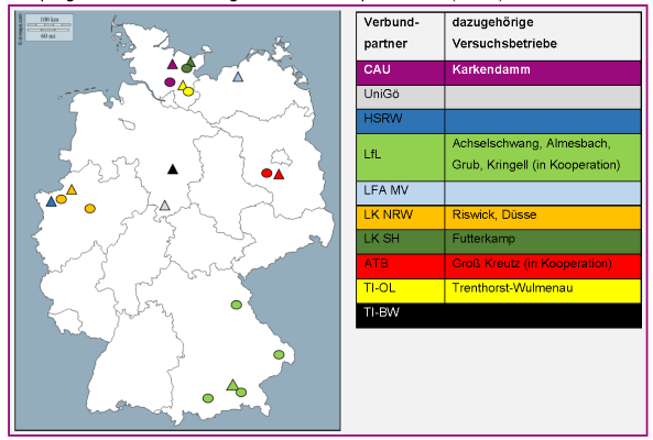 Wie sieht die Rinderhaltung der Zukunft aus?17. Juni 2021 Einer der Versuchsbetriebe des Verbundprojekts ist Karkendamm in Bimöhlen. Foto: © Nadine Schnippkoweit, Uni Kiel Verbundvorhaben InnoRind erarbeitet innovative Ansätze für die Rinderhaltung von morgen Seit Mai diesen Jahres fördert das Bundesministerium für Ernährung und Landwirtschaft (BMEL) das Verbundvorhaben „InnoRind – zukunftsfähige Rinderhaltung in Deutschland unter Berücksichtigung von Tierwohl, Umweltwirkungen und gesellschaftlicher Akzeptanz“ an der Christian-Albrechts-Universität zu Kiel (CAU). Im Mittelpunkt der Betrachtungen stehen unter anderem die Aufzucht von Kälbern und Jungrindern und die Haltung von Mast- und Milchrindern. Unter der Leitung von Professor Georg Thaller von der Agrar- und Ernährungswissenschaftlichen Fakultät wurden die Kompetenzen im Bereich der Nutztierhaltung in Deutschland in einem deutschlandweiten Innovationsnetzwerk zur Rinderhaltung gebündelt. Die Aufgabe des Netzwerks besteht darin den Status quo der deutschen Rinderhaltung zu ermitteln, um Verbesserungspotentiale zu erkennen und die Umsetzung der Verbesserungen auf den Versuchsbetrieben zu planen.„Für uns ist es etwas Besonderes, ein Verbundprojekt dieser Größe und dieser Bedeutung im Bereich Tierwohl koordinieren zu dürfen. Mit zehn Projektpartnern und ihren Versuchsbetrieben wollen wir innovative Haltungs- und Managementkonzepte für den Kälber-, Mast- und Milchviehbereich entwerfen, die das Tierwohl auf zahlreichen Rinderbetrieben in Deutschland verbessern können. Gleichzeitig legen wir einen Schwerpunkt auf die Reduzierung von Emissionen und die gesellschaftliche Akzeptanz unserer Maßnahmen. Nur wenn der Verbraucher mitgenommen wird, können wir die Rinderhaltung auch für die nächsten Jahrzehnte nachhaltig und wettbewerbsfähig gestalten“, so Nadine Schnipkoweit, Koordinatorin des Projektes vom Institut für Tierzucht und Tierhaltung. Karte: Standorte der Projektpartner (farbige Dreiecke) und der kooperierenden Versuchsbetriebe (farbige Kreise) repräsentieren die Hauptregionen der Rinderhaltung in Deutschland. Foto: © Nadine Schnippkoweit, Uni Kiel Kuhgebundene Kälberaufzucht ist geplantSchwerpunktthemen des geplanten Innovationsnetzwerks sind unter anderem die kuhgebundene Kälberaufzucht, bei der die Kälber nicht von den Kühen getrennt werden. Auch neue Möglichkeiten der Vermarktung männlicher Reinzuchtkälber sind auf der Agenda. In spezialisierten Milchviehbetrieben sind die Aufzuchtmöglichkeiten begrenzt und bei sinkender Nachfrage nach Rindfleisch bevorzugen Mastbetriebe Kälber von Rassen, deren Zucht stärker auf Fleischleistungsmerkmale ausgerichtet ist. Dies hat geringere Erlöse für Reinzuchtkälber aus Milchrassen zur Folge.Im nächsten Schritt sollen die im Netzwerk erarbeiteten Ansätze auf den Versuchsbetrieben erprobt werden, um anschließend direkt von landwirtschaftlichen Betrieben umgesetzt zu werden.Über InnoRindFür die Projektdauer von sechs Monaten stellt das BMEL rund 300.000 Euro für die zehn Projektpartner bereit, davon gehen 96.500 Euro an die CAU. Zusätzlich zu den Projektpartnern sind zehn Versuchsbetriebe eingebunden, die weitgehend die Hauptregionen der Rinderhaltung in Deutschland repräsentieren. Projektpartnerpartner:• Christian-Albrechts-Universität zu Kiel (CAU)• Georg-August-Universität Göttingen (UniGö)• Hochschule Rhein-Waal (HSRW)• Bayerische Landesanstalt für Landwirtschaft (LfL)• Landesforschungsanstalt für Landwirtschaft und Fischerei Mecklenburg-Vorpommern (LFA MV)• Landwirtschaftskammer Nordrhein-Westfalen (LK NRW)• Landwirtschaftskammer Schleswig-Holstein (LK SH)• Leibniz-Institut für Agrartechnik und Bioökonomie (ATB) e.V.• Thünen-Institut für Ökologischen Landbau (TI-OL)• Thünen-Institut für Betriebswirtschaft (TI-BW)Kompetenzzentrum Milch Schleswig-Holstein (KMSH)Auch das Kompetenzzentrum Milch Schleswig-Holstein vom Institut für Tierzucht und Tierhaltung der CAU Kiel ist beteiligt. Es stellt eine mittlerweile überregional bekannte Plattform für Forschung, Innovation und Technologietransfer rund um die Milch dar und garantiert einen schnellen Transfer von Projektergebnissen in die landwirtschaftliche Praxis. Als Schnittstelle zwischen Praxis, Wirtschaft und Wissenschaft hat es in den vergangenen Jahren mehrere große Verbundprojekte erfolgreich koordiniert.