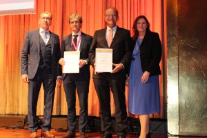 Wissenschaft mit Flair – Eröffnungsversanstaltung des VSOU 20193. Mai 2019 Der VSOU-Vorsitzende Thomas Möller (l.) eröffnete die Abendveranstaltung bevor die Kongresspräsidenten Christian Heiß und Philipp Drees (r.) übernahmen (Foto: Biermann Medizin, hr) Am Abend des ersten Tages des diesjährigen VSOU-Kongresses zeigten sich die Kongress-Präsidenten, Prof. Philipp Drees und Prof. Christian Heiß, auf der feierlichen Eröffnung im Bénazet-Saal des Kurhauses zufrieden. Getreu dem Kongress-Motto „Gesundheit durch Bewegung“ lieferte der Mainzer Kabarettist Tobias Mann ein bewegtes Programm. Zudem wurden VSOU-Ehrenmitgliedschaften und der OUP-Best-Price verliehen. Gesundheit ist das höchste Gut und der Motor ist die Bewegung“, erläuterte Heiß in seinem Grußwort die Wahl des Kongressmottos. Dabei lege die Arbeit von Orthopäden und Unfallchirurgen die Grundlage für soziale Teilhabe und Lebensqualität der Patienten, so Heiß weiter. Das Kongressmotto spiegele sich nicht nur im wissenschaftlichen Programm wider, sondern auch in der Gestaltung des Festabends und der Abschlussveranstaltung. Ein wissenschaftlicher Kongress für alle solle der VSOU sein und dabei habe man das Flair von Baden-Baden erhalten und fortführen wollen, ergänzte Drees. Er betonte: „Wir wollen zeigen, dass O & U ein Fach ist.“ Dies gelte insbesondere für die Ausbildung, diese Aufgabe müsse gemeinsam wahrgenommen werden. In ständiger Bewegung bespielte Tobias Mann die Bühne und nahm das Publikum mit (Foto: Biermann Medizin, hr). Als für manchen ungewohntes „Feuerwerk und Chaos“ beschrieb Drees das Highlight des Eröffnungsabends: den Auftritt des Kabarettisten Tobias Mann. Auf der Bühne sorgte der Mainzer mit großen Gesten und viel Bewegung für Lacher im Publikum. Er nahm Politik, menschliche Sammelwut, die Abhängigkeit vom Smartphone oder nervende Nachbarn mit lauten Gartengeräten aufs Korn. Mann glänzte nicht nur durch Satire und Wortwitz, sondern auch mit Gesangseinlagen, bei denen er sich selbst an Gitarre oder Klavier begleitete. Am Ende sorgte Manns „Faust-Rapp“, entwickelt, um Schülern Göthes Faust in fünf Minuten nahe zu bringen, auch für Bewegung im Publikum. Auszeichnungen Die neuen VSOU-Ehrenmitglieder Axel Goldmann und Stefan Sell (mitte v.l.) umrahmt von den VSOU-Vorständen Thomas Möller und Andrea Meurer (Foto: Biermann Medizin, hr) Neben der Unterhaltung durften auch Auszeichnungen für besondere Verdienste nicht fehlen. So erhielten Dr. Axel Goldmann und Dr. Stefan Sell die Ehrenmitgliedschaft der VSOU, beide für Ihre langjährige Tätigkeit als Schriftführer der Vereinigung. Des weiteren wurde der OUP-Best-Price verliehen. Die 2000 Euro Preisgeld teilten sich in diesem Jahr Dr. Uwe Schütz, Klinik für Diagnostische und Interventionelle Radiologie, Uniklinikum Ulm und Dr. Stefan Middeldorf, Schön Klinik Bad Staffelstein. Schütz erhielt den Preis für den Beitrag “Moderne bildgebende Diagnostik der Arthrose im Allgemeinen und der großen Gelenke der unteren Extremität” (OUP 2018;7:349–365.) Middeldorf wurde für den Artikel “Das schmerzbezogene quantitative Leistungsvermögen in der schmerzmedizinischen orthopädisch-unfallchirurgischen Begutachtung” (OUP 2018;7:510–516.) ausgezeichnet. (ja/hr)