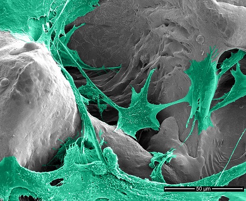 Zweifacher Infektionsschutz für Implantate18. November 2020 Hüftschaftdemonstrator mit hybrider Beschichtung im Schaftbereich (© Fraunhofer IFAM). Eine hybride Beschichtung von Implantaten aus antibakteriell wirksamem Silber und einem Antibiotikum soll künftig Patienten vor Infektionen schützen. Für noch bessere Schutzwirkung wird das Antibiotikum speziell auf den Patienten bzw. den Keim abgestimmt. Bei durchschnittlich ein bis zwei Prozent der PatientInnen, die ein künstliches Gelenk erhalten, treten nach der Operation Infektionen auf. Sind die Beschwerden so gravierend, dass eine Revision notwendig wird, ist bei bis zu vier Prozent der Fälle mit Infektionen zu rechnen1. Das Projekt AntiSelektInfekt – eine Kooperation zwischen Fraunhofer-Institut für Fertigungstechnik und Angewandte Materialforschung IFAM in Bremen und einem Forscher-Team des Julius-Wolff-Instituts und des BIH Centrums für Regenerative Therapien (BCRT) der Berliner Charité – hat daher den neuen Ansatz der hybriden Beschichtung entwickelt, der verspricht, das Infektionsrisiko deutlich zu senken. Die Ergebnisse sind nach Angaben der Beteiligten vielversprechend. »Die präklinischen Studien haben bewiesen, dass die hybride Beschichtung des Implantats die Infektionsrate wirksam senkt«, erklärt Prof. Britt Wildemann. Sie leitete die Studien zur Wirksamkeit und Biokompatibilität in Berlin und ist jetzt Leiterin der Experimentellen Unfallchirurgie am Universitätsklinikum Jena. Schon lange werde die Wirkung von Silber oder Antibiotika bei der Bekämpfung von Implantat-assoziierten Infektionen erforscht, neu sei allerdings der Ansatz, beide miteinander zu kombinieren. »Im ersten Schritt wird die Oberfläche des Titan-Implantats mit einem Laser strukturiert. Dadurch entsteht eine poröse Schicht«, so Kai Borcherding, Geschäftsfeldleiter Medizintechnik und Life Sciences am Fraunhofer IFAM. Auf der Titanoberfläche entstünden so amphorenförmige Vertiefungen (oben eng, nach unten weit), mit einer Größe im Mikrometerbereich. In einem zweiten Schritt werde mittels Dampfphasenabscheidung eine Schicht mit Silberpartikeln aufgebracht. Elektronenmikroskopische Aufnahme von Osteoblast-ähnlichen Zellen (MG-63) auf der Hybrid-Beschichtung (© Fraunhofer IFAM). Bei der Operation können diese amphorenförmigen Poren beladen werden. Unmittelbar vor der Implantation taucht der Arzt oder die Ärztin das bereits mit Silber beschichtete, sterile Implantat in eine Lösung mit dem Antibiotikum ein, erklärt das Fraunhofer IFAM weiter. »In den präklinischen Studien haben wir gesehen, dass der ganze Vorgang nur wenige Minuten dauert und sehr einfach zu handhaben ist«, so Wildemann. Sobald das Implantatn eingesetzt werde, beginne die Freisetzung des Antibiotikums in das umliegende Gewebe. Bakterien, die eine Infektion auslösen könnten, werden schnell abgetötet. Die Silberbeschichtung wirkt verzögert und wesentlich länger. Die Silberionen sind über mehrere Wochen aktiv und schützen während der Heilungsphase vor Infektionen, so die Forschenden.Laut Fraunhofer IFAM wurden in Labortests mit humanen Knochenzellen als auch im Tiermodell die Biokompatibilität und die Osteo-Integration untersucht. »Eine Herausforderung bei der Entwicklung bestand beispielsweise darin, dass die Konzentration des Antibiotikums hoch genug ist, die Bakterien zu töten. Andererseits durfte sie nicht so hoch sein, dass die anwachsenden Knochenzellen geschädigt werden«, erklärt Borcherding.Ein weiterer Vorteil sei, dass die poröse Titanoberfläche den Knochen besser einwachsen lasse. »Unsere Studie hat gezeigt, dass der Knochenkontakt durch die Oberflächenmodifikation gesteigert werden konnte: 89 Prozent Kontakt bei Implantaten mit der Hybrid-Beschichtung und nur 52 Prozent Knochenkontakt in der Kontrollgruppe. Zusätzlich konnten wir nachweisen, dass die Zellen in die amphorenförmigen Poren hineinwachsen und das Implantat dadurch deutlich besser fixieren«, bestätigt Wildemann. 1 Izakovicova P., et al. 2019, DOI: 10.1302/2058-5241.4.180092